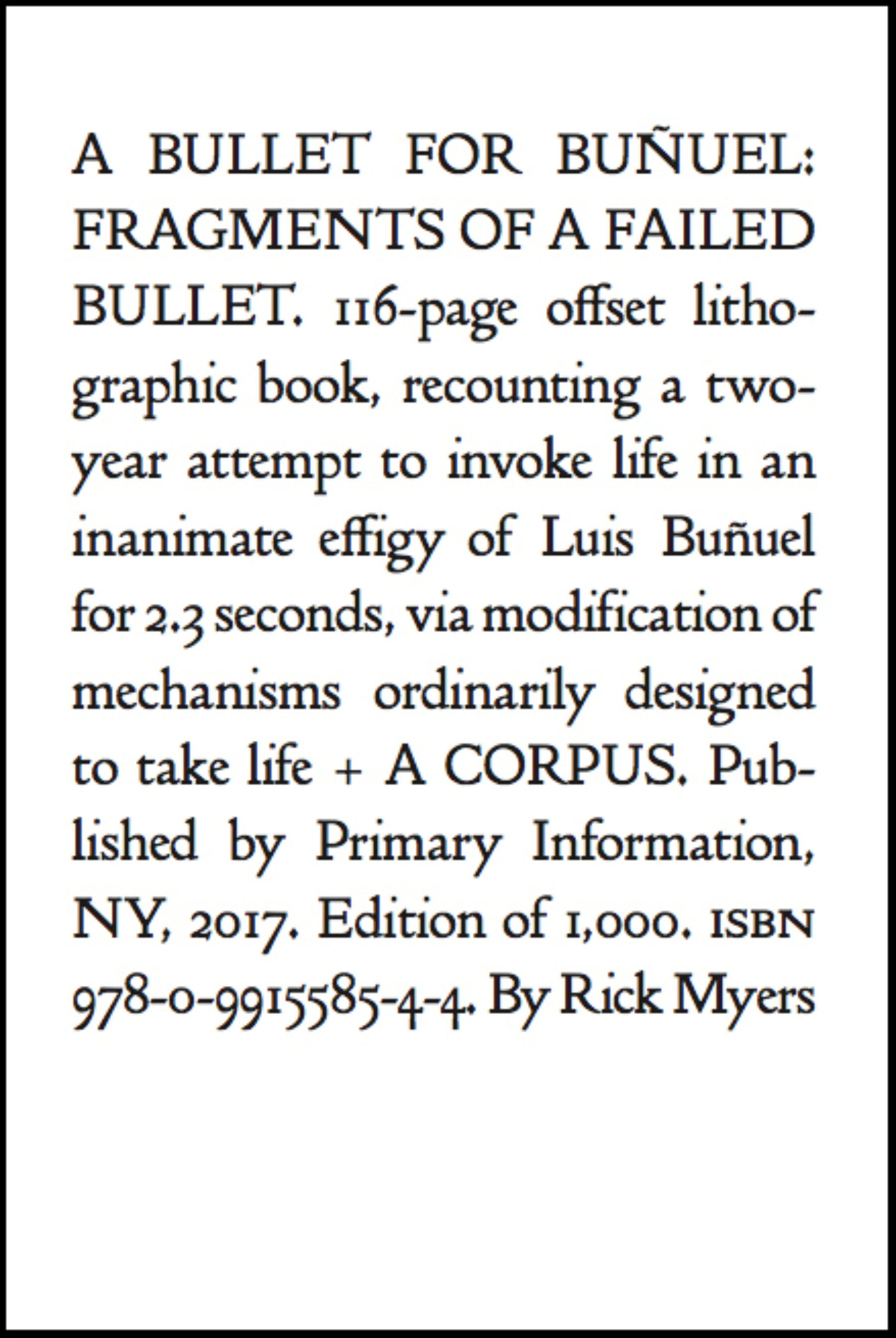 A Bullet for Buñuel: Fragments of a Failed Bullet documents Rick Myers’ attempt to complete a project begun by the late filmmaker Luis Buñuel: to create a bullet possessing such a weak charge that it would simply bounce off the filmmaker’s shirt when fired at him. Consulting with the estate and sources ranging from online forums for bullet makers to a ballistics lab associated with the United States Secret Service, Myers sought to make the bullet and fire it at a shirt that had been worn by Buñuel. While trying to bring this absurdist endeavor to completion, the artist was met with a colorful cast of characters and failures at almost every turn. A Bullet for Buñuel has taken many forms—a video work, a multiple, and a performative lecture—all of which are represented in this publication. Myers’ writing, research, correspondence, and photographs are also included in the book, which synthesizes years of work into a singular meditation on the poetics of failure. Primary Information, 2017