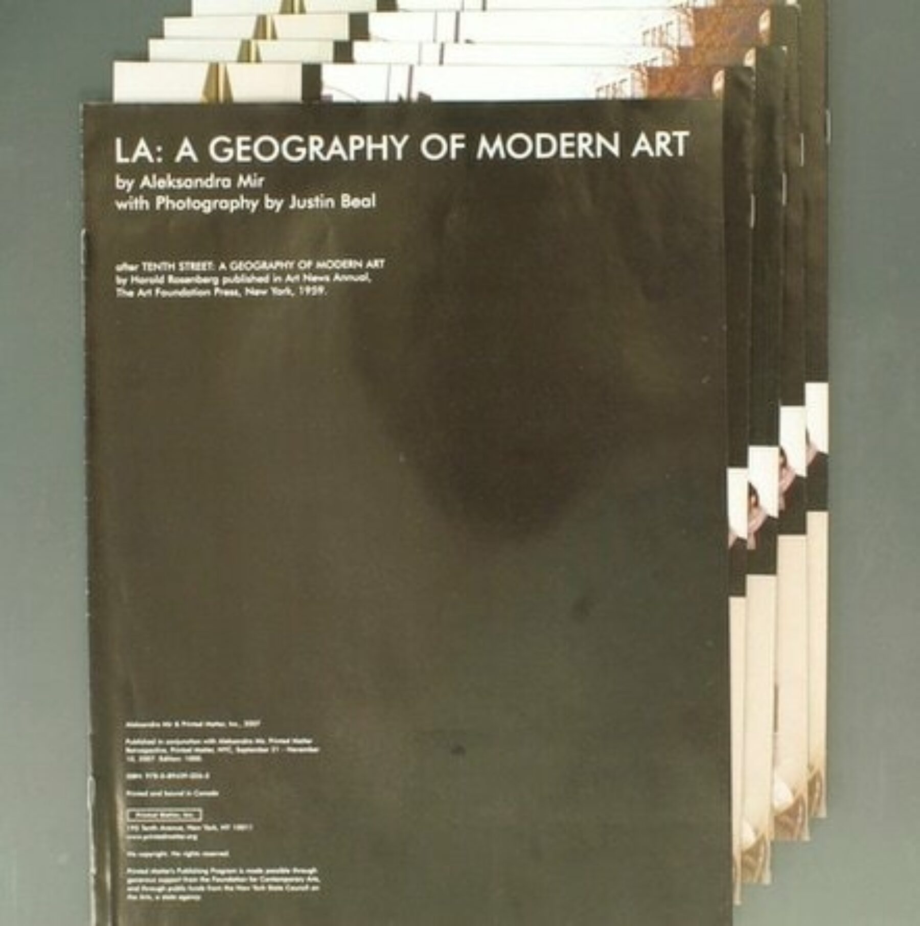 Aleksandra Mir’s oversized booklet is a modern, west coast take on Harold Rosenberg’s “Tenth Street: A Geography of Modern Art” published in Art News Annual by the Art Foundation Press in 1959. Mir’s version reads almost like an art school brochure, designed to give perspective students a glimpse at what “residential life” is like in the Southern Californian art scene. Photographs by Justin Beal document the bar scene, dinners, lectures, dance workshops, openings, and events where art appears as background scenery against which an international group of artists and students mingle.